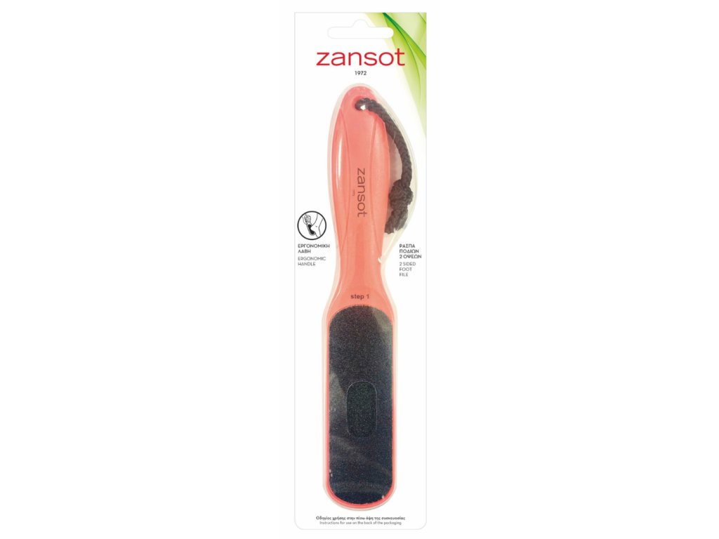 Plastový pilník na nohy Zansot má oboustranný povrch pro okamžité a viditelné výsledky: